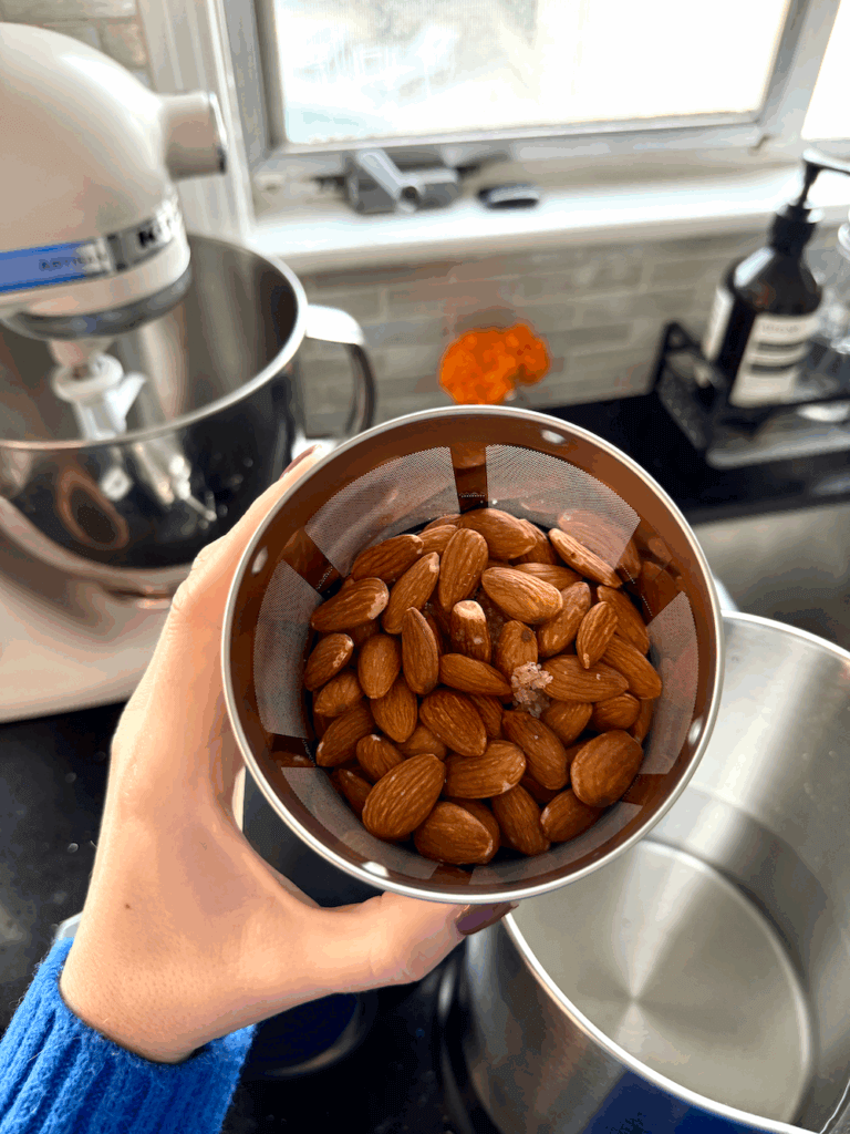 In keeping with the brand’s name sake, let’s use the almonds as the example here. If you’re more in the oat milk camp, it’s the same process, but with whole grain oats that are soaked overnight, and just 1/2 tsp of an oil like walnut or avocado since oats don’t have any natural fats.
